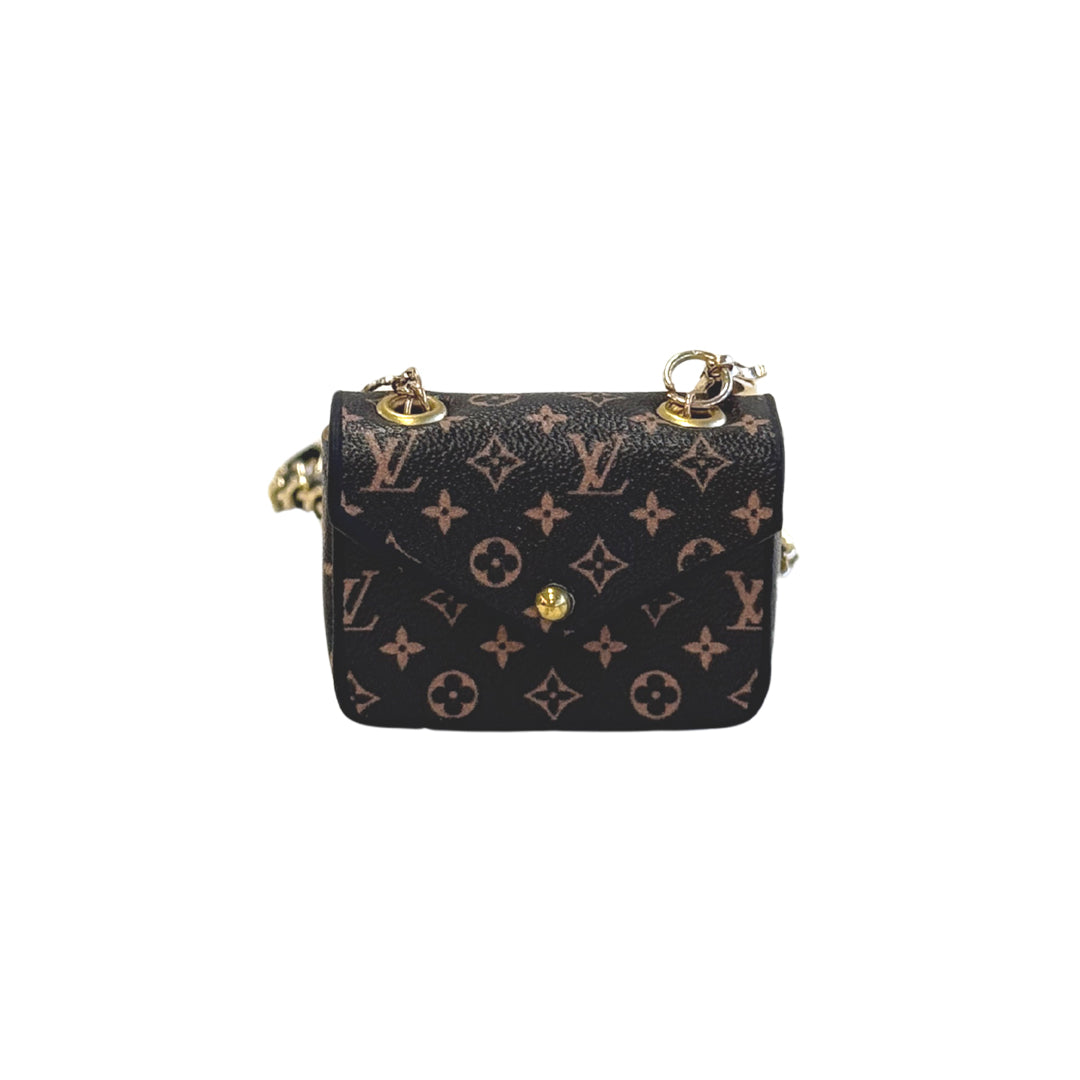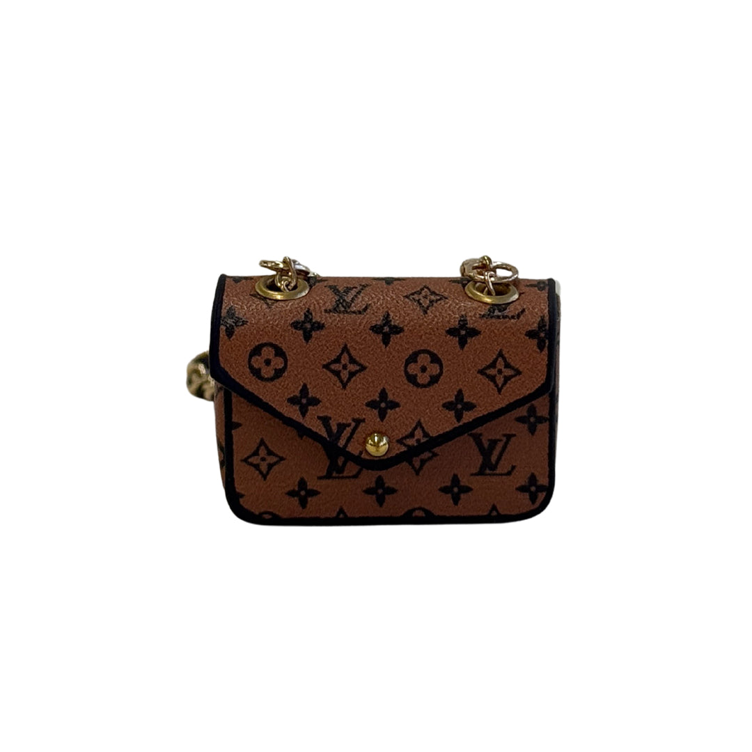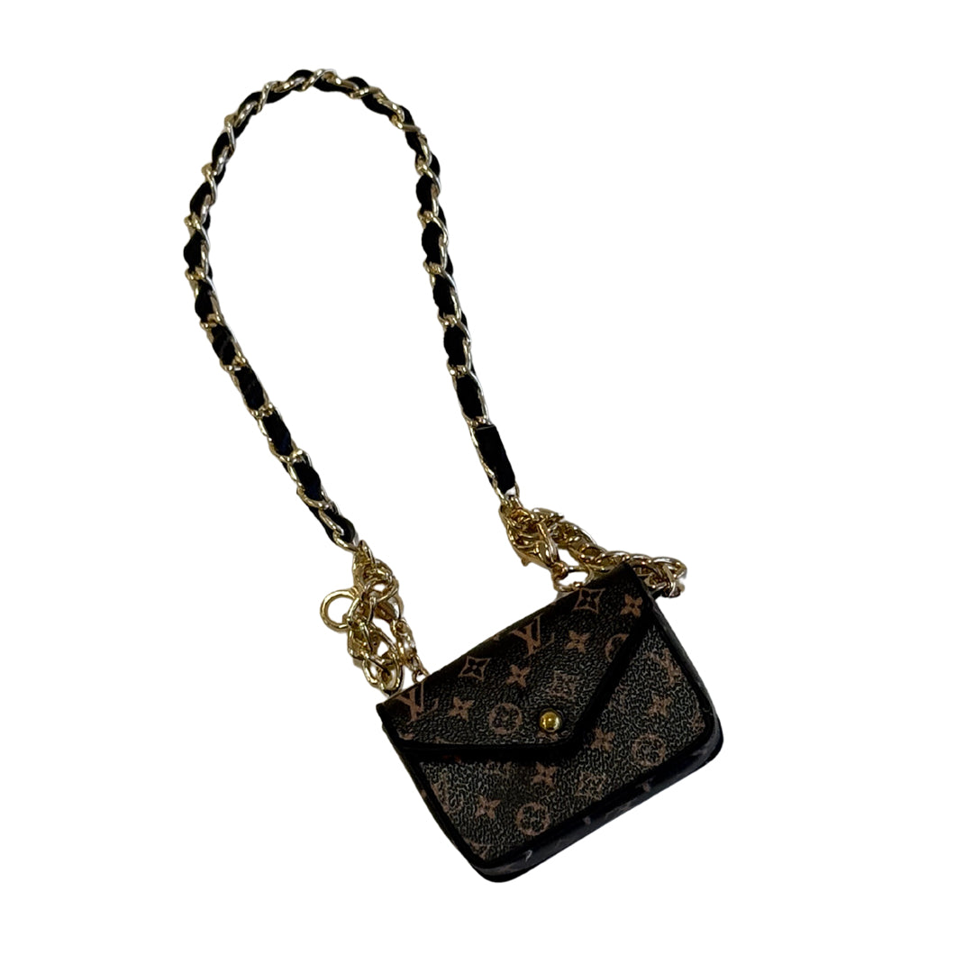This luxury accessory brings high-end fashion elements to your Labubu collection. The bag features the iconic monogram pattern with intricate detailing, complemented by elegant golden hardware that catches the light beautifully. The classic envelope design and chain strap create an authentic luxury handbag experience in miniature form.